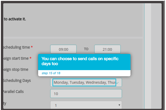 The call scheduling days and time allow you to schedule a campaign to be processed at a later stage. Scenario: You need to launch a marketing campaign for Diwali. Calls need to be placed over the weekend before Diwali. However, you are going to be ...